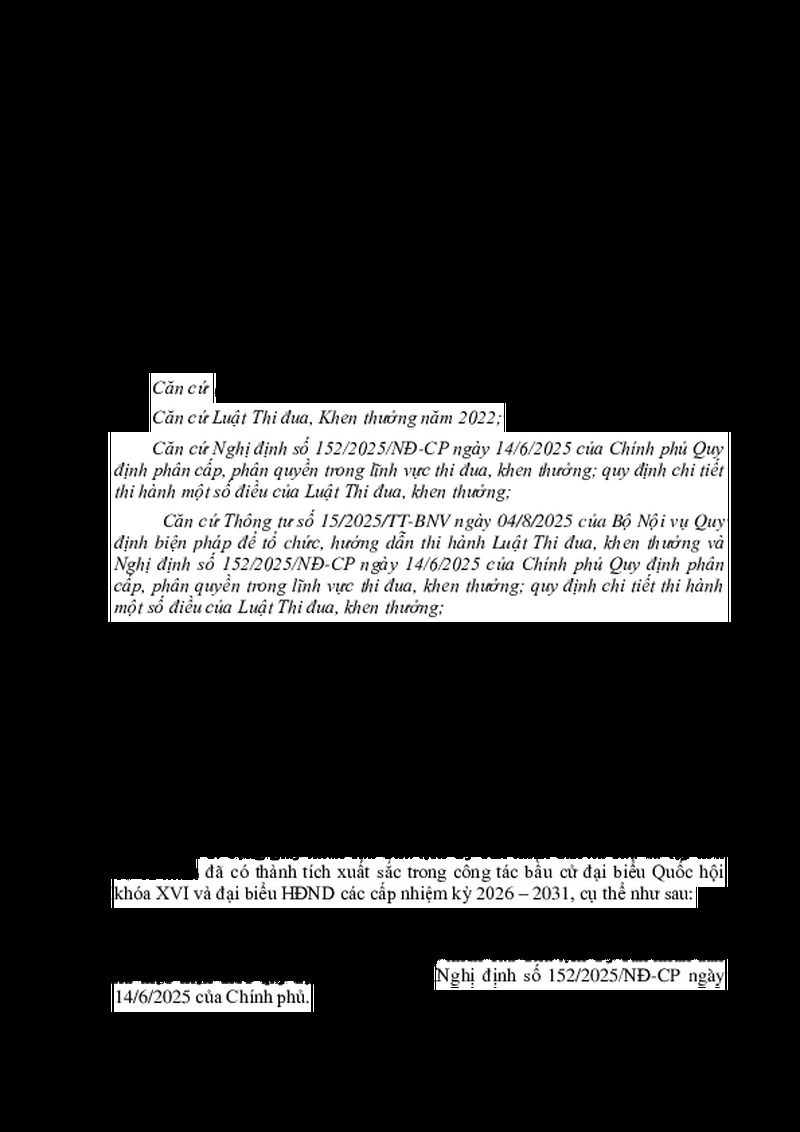 | Tiêu đề văn bản | QUYẾT ĐỊNH Về việc tặng giấy khen của Chủ tịch Uỷ ban nhân dân xã đối với các tập thể, cá nhân có thành tích trong công tác bầu cử đại biểu Quốc hội khóa XVI và đại biểu HĐND các cấp nhiệm kỳ 2026-2031 | ||