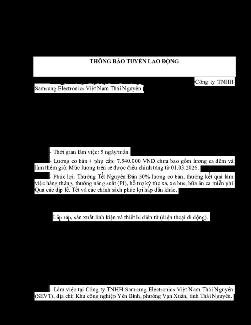 Thông báo tuyển lao động Công ty TNHH Samsung Electronics Việt Nam Thái Nguyên