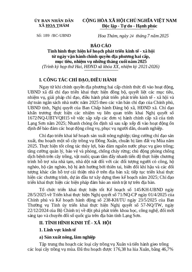 | Tiêu đề văn bản | Tình hình thực hiện kế hoạch phát triển kinh tế - xã hội từ ngày vận hành chính quyền địa phương hai cấp, mục tiêu, nhiệm vụ những tháng cuối năm 2025 | ||