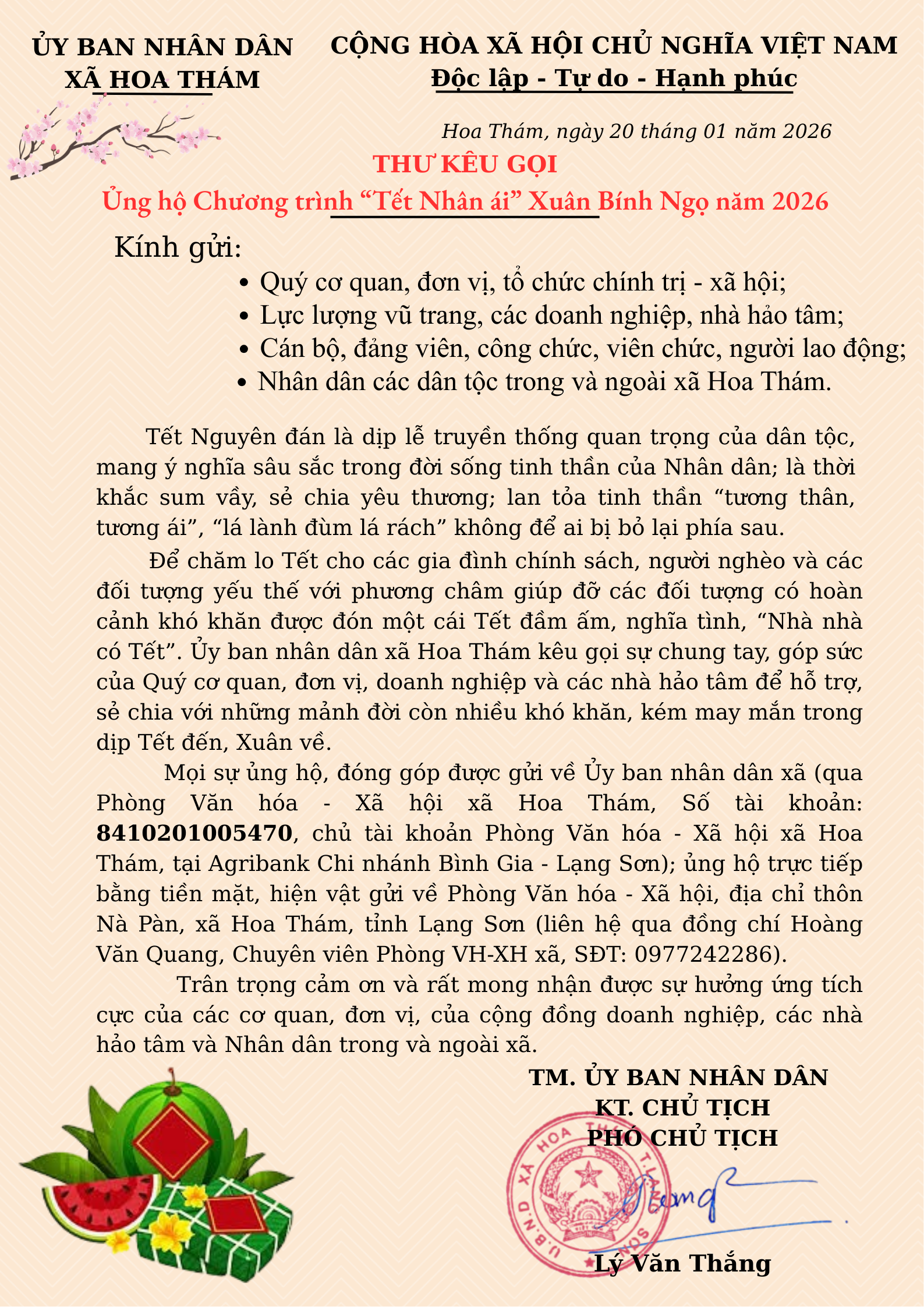 Thực hiện Chương trình “Tết Nhân ái” Xuân Bính Ngọ năm 2026, Ủy ban nhân dân xã Hoa Thám trân trọng kêu gọi các cơ quan, đơn vị, doanh nghiệp, các nhà hảo tâm, cán bộ, công chức, viên chức, người lao động và Nhân dân trong và ngoài xã chung tay ủng hộ, giúp đỡ các gia đình chính sách, hộ nghèo, người có hoàn cảnh khó khăn được đón Tết Nguyên đán đầm ấm, nghĩa tình.