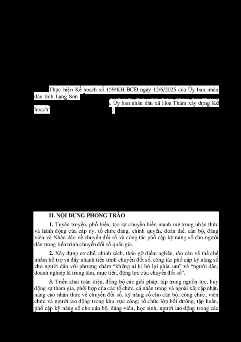 | Tiêu đề văn bản | KẾ HOẠCH Phát động phong trào thi đua lập thành tích trong Phong trào “Bình dân học vụ số” trên địa bàn xã Hoa Thám | ||