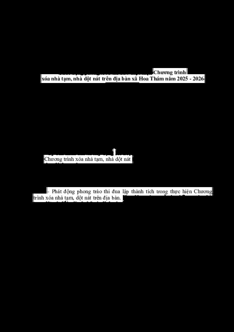 | Tiêu đề văn bản | KẾ HOẠCH Phát động phong trào thi đua thực hiện Chương trình xóa nhà tạm, nhà dột nát trên địa bàn xã Hoa Thám năm 2025 - 2026 | ||
