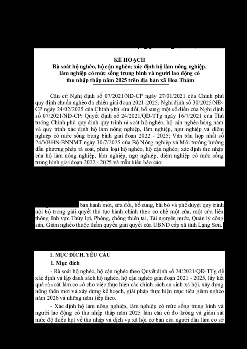 | Tiêu đề văn bản | KẾ HOẠCH Rà soát hộ nghèo, hộ cận nghèo; xác định hộ làm nông nghiệp, lâm nghiệp có mức sống trung bình và người lao động có thu nhập thấp năm 2025 trên địa bàn xã Hoa Thám | ||