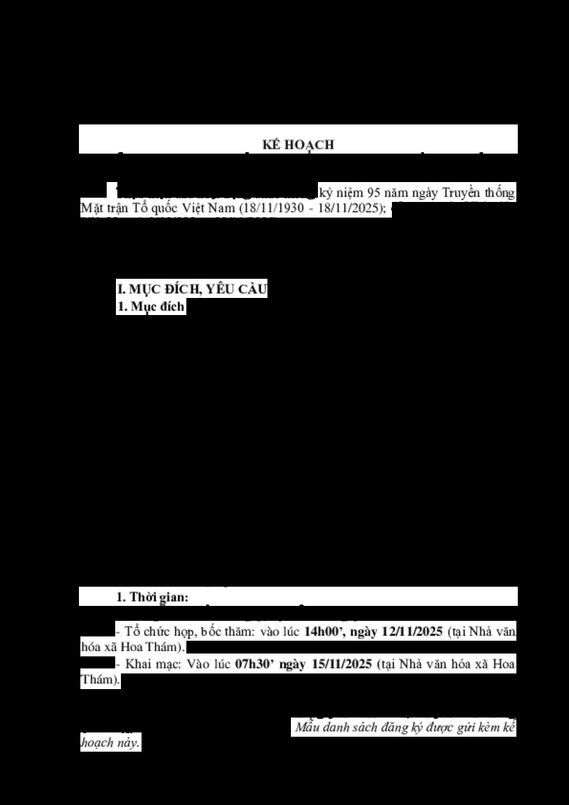 | Tiêu đề văn bản | KẾ HOẠCH Tổ chức Giải bóng chuyền hơi nam, nữ xã Hoa Thám lần thứ Nhất | ||