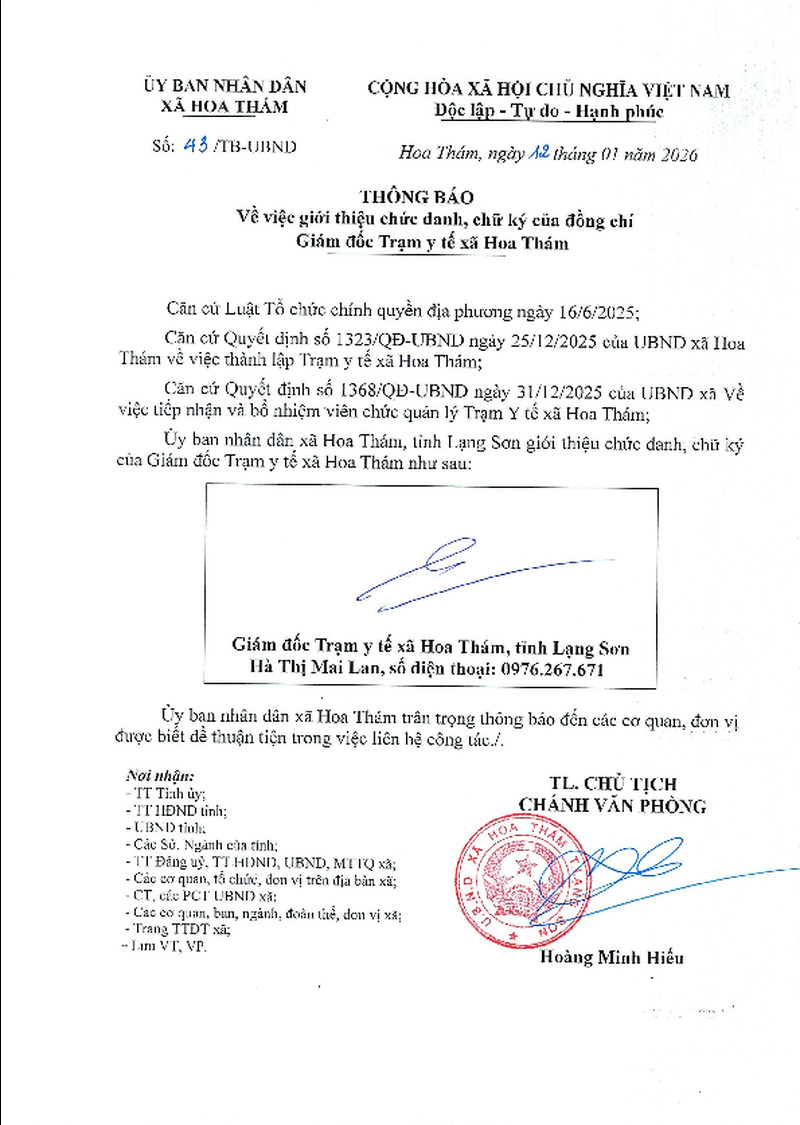 | Tiêu đề văn bản | THÔNG BÁO Giới thiệu chức danh và chữ ký của Giám đốc Trạm Y tế xã Hoa Thám | ||