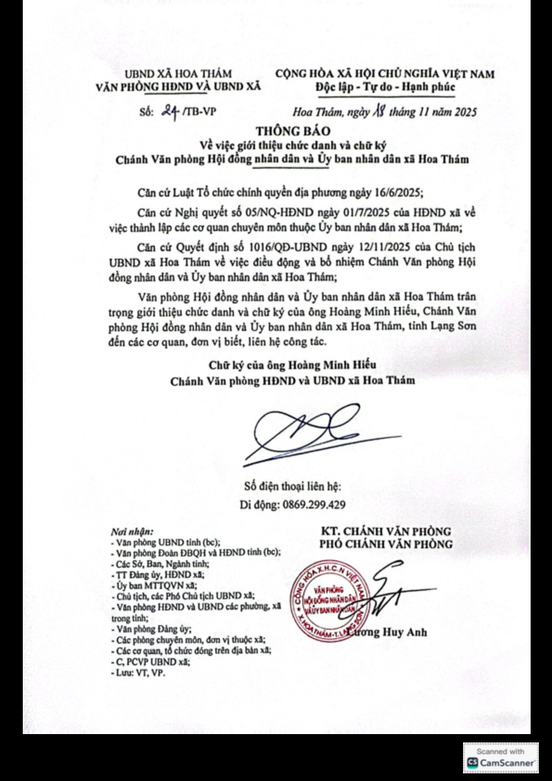 | Tiêu đề văn bản | THÔNG BÁO Về việ c giới thiệu chức danh và chữ ký Chánh Văn phòng Hội đồng nhân dân và Ủy ban nhân dân xã Hoa Thám | ||
